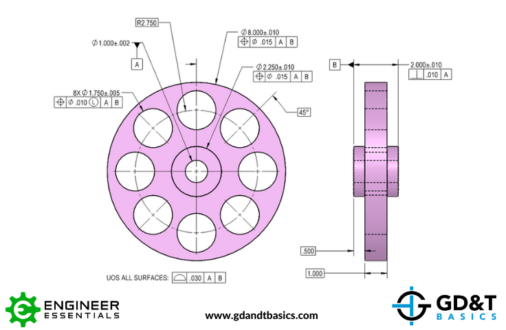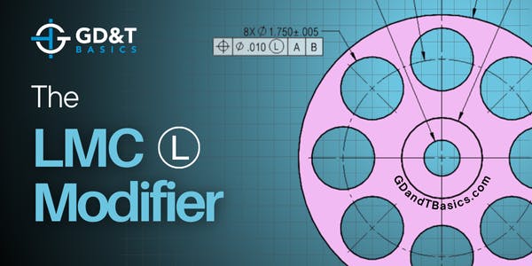 Starting with the above figure from ASME Y14.5-2018, Jason explains how the LMC modifier is applied in the feature control frame and how it relates to bonus tolerance. He then gives more clarification by discussing an example from our course of a flywheel, shown below, containing a pattern of eight holesIn this example, the holes are being controlled with a feature control frame that includes a diametric position tolerance that is modified at LMC.