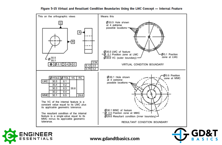 Jason walks through two different scenarios for this flywheel – one where a hole is manufactured at its LMC size and another where it is manufactured at its MMC size. He shows how the LMC modifier is used to establish a minimum wall thickness, how it affects the available position tolerance, and how improper use can unintentionally reduce the functional clearance in an assembly.