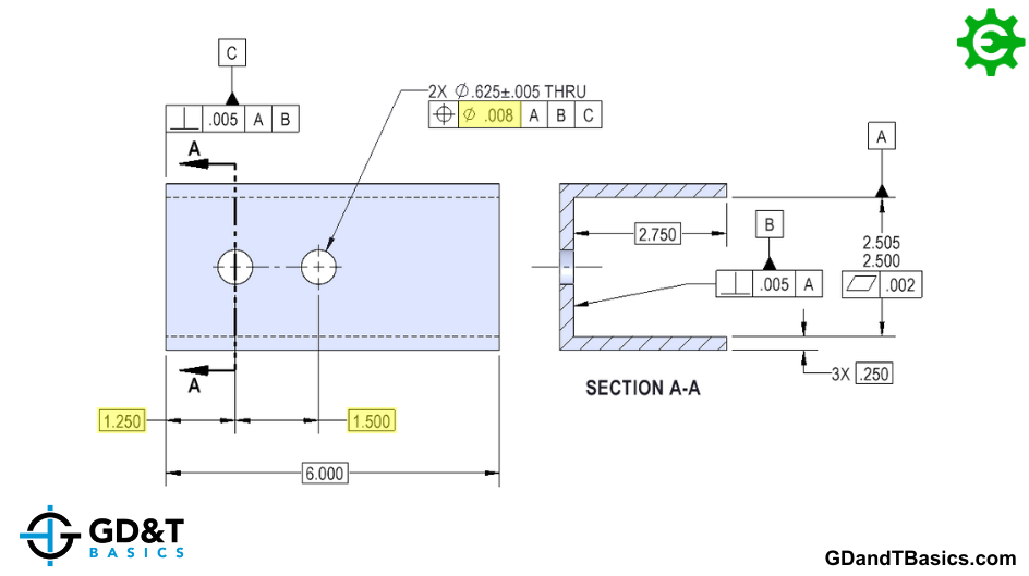 Let’s convert this to a GD&T drawing to show how the GD&T Position control solves this problem. GD&T Position tolerance is diametric, so using the Pythagorean Theorem, we can convert the +/- .003 rectangular tolerances from the previous example to a total diametric tolerance of .008. This is the Position tolerance value found in the feature control frame. We would then change the toleranced dimensions locating the holes in the previous example to basic dimensions (indicated as boxed dimensions), establishing the True Position of the holes.