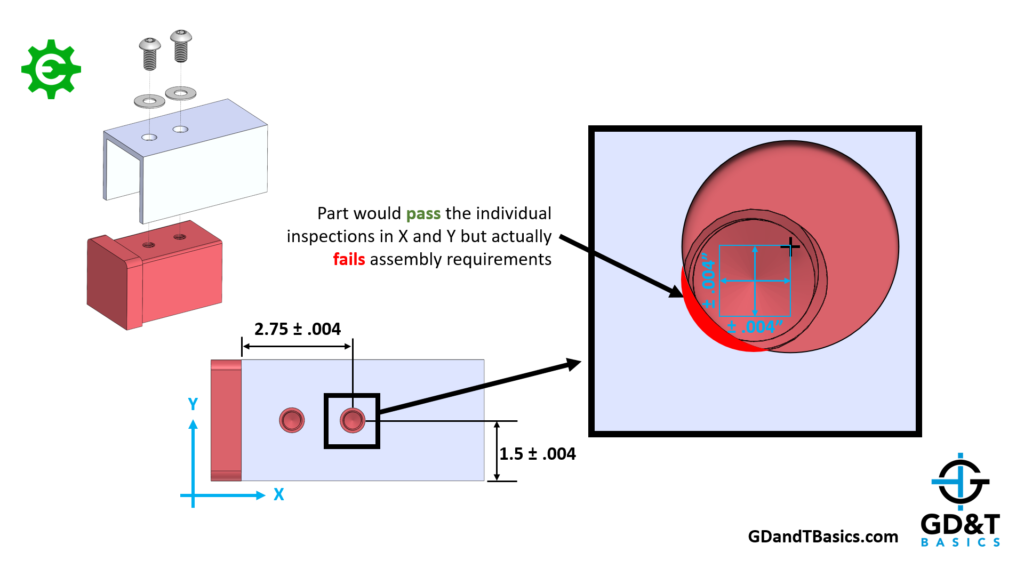 But what if the hole drifts simultaneously in the maximum amount for both the X and Y directions? You can see that though it would pass inspection, there would be interference with the fastener during assembly. Therefore, you would need to determine the tolerances required to prevent this worst-case scenario.