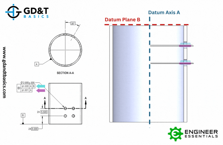 In Figure 1, we see a pattern of four holes on the outside of a cylinder that is being controlled with composite position. In the upper feature control frame, the holes are being controlled with position with respect to Datums A and B. The lower frame then refines the position with respect to Datum A. On the drawing, Datum Feature A is indicated as the OD of the cylinder, resulting in Datum Axis A. Datum Feature B is indicated as the bottom surface of the cylinder, resulting in Datum Plane B.