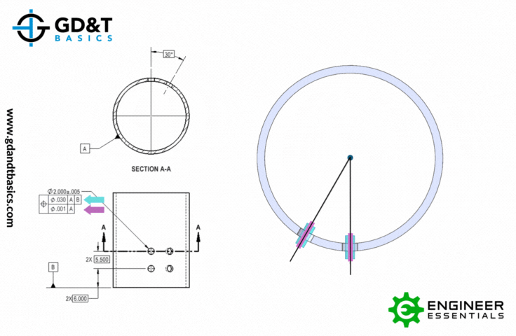 Because the lower frame only controls orientation, the holes are also no longer being controlled in location to Datum A. This means that the axes of the holes no longer have to converge, or be radially located, with Datum Axis A. Since the holes are a pattern, the only requirement is that they stay 30 degrees from each other, as indicated in the basic dimension. This allows the holes to move as shown in Figure 4.
