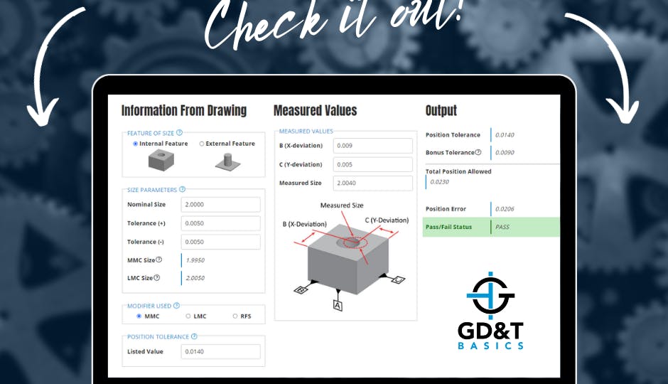 Calculate your true position with GD&T Basics’ handy calculator. Convert your X and Y deviation measurements into an actual diametric deviation, which you can then compare to the position tolerance listed in your feature control frame.